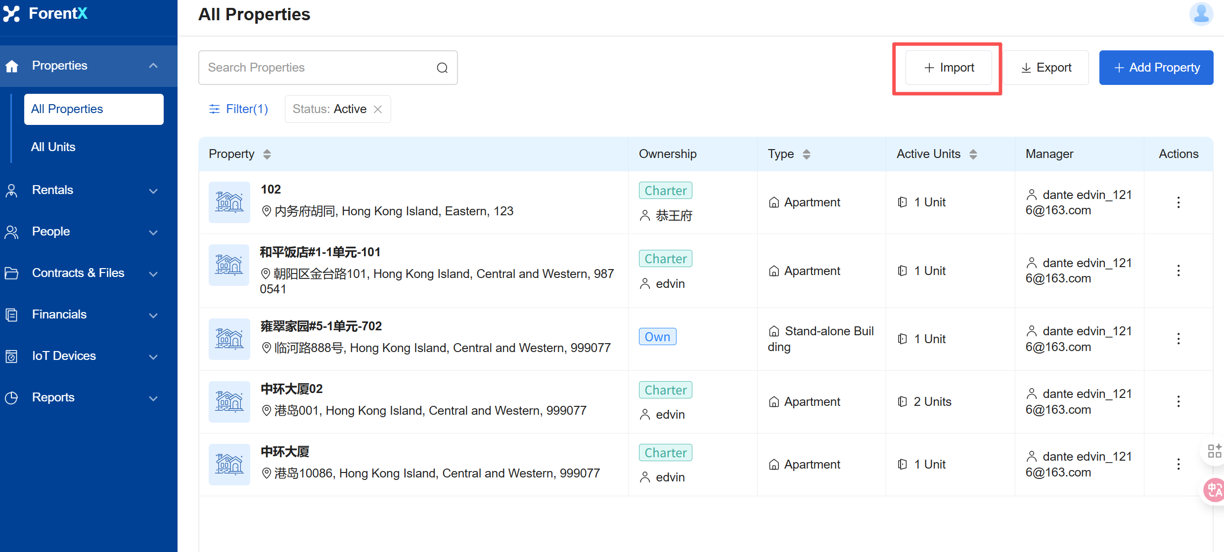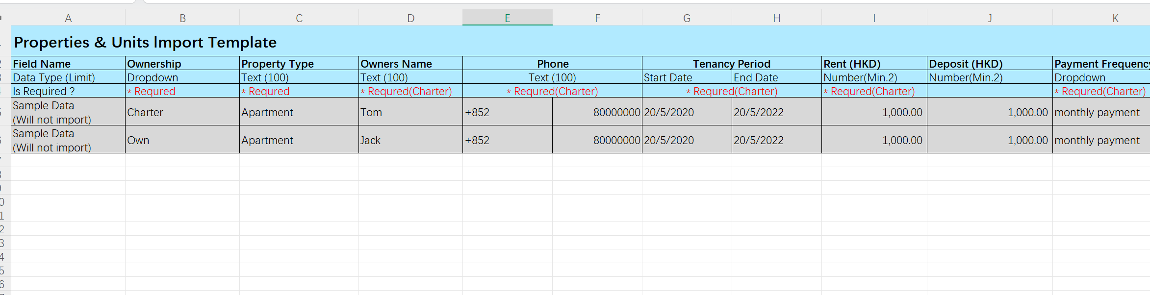 • Units under the same property must be in the same Excel import, separating them will create multiple properties.