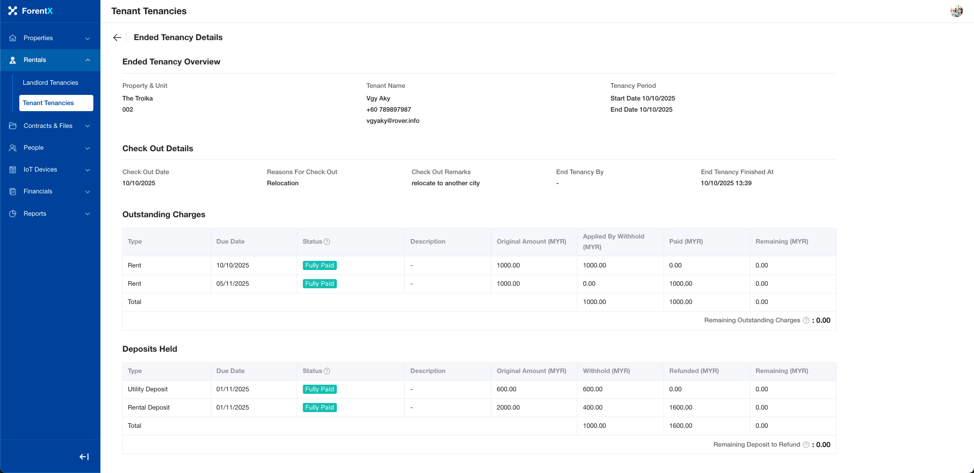 - Billing Settlement: A clear breakdown of how the Outstanding Charges and Deposits Held were handled during the financial settlement stage of the move-out.