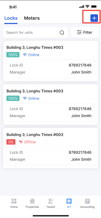 Step1:Turn on Bluetooth and near the smart lock,click [IoT]>[Add Locks];