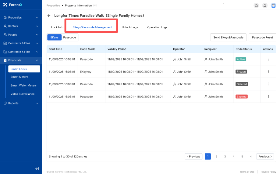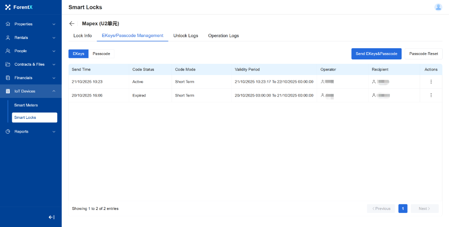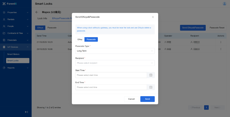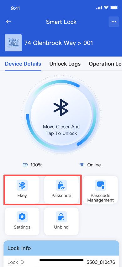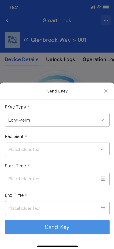 Step2:Enter the smart lock details page and select Ekey/Passcode to send;