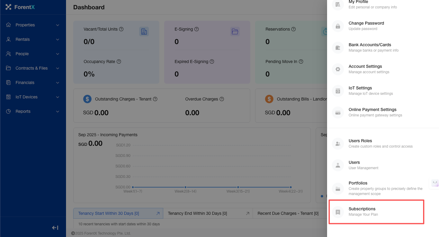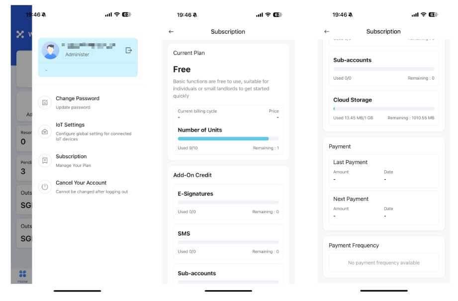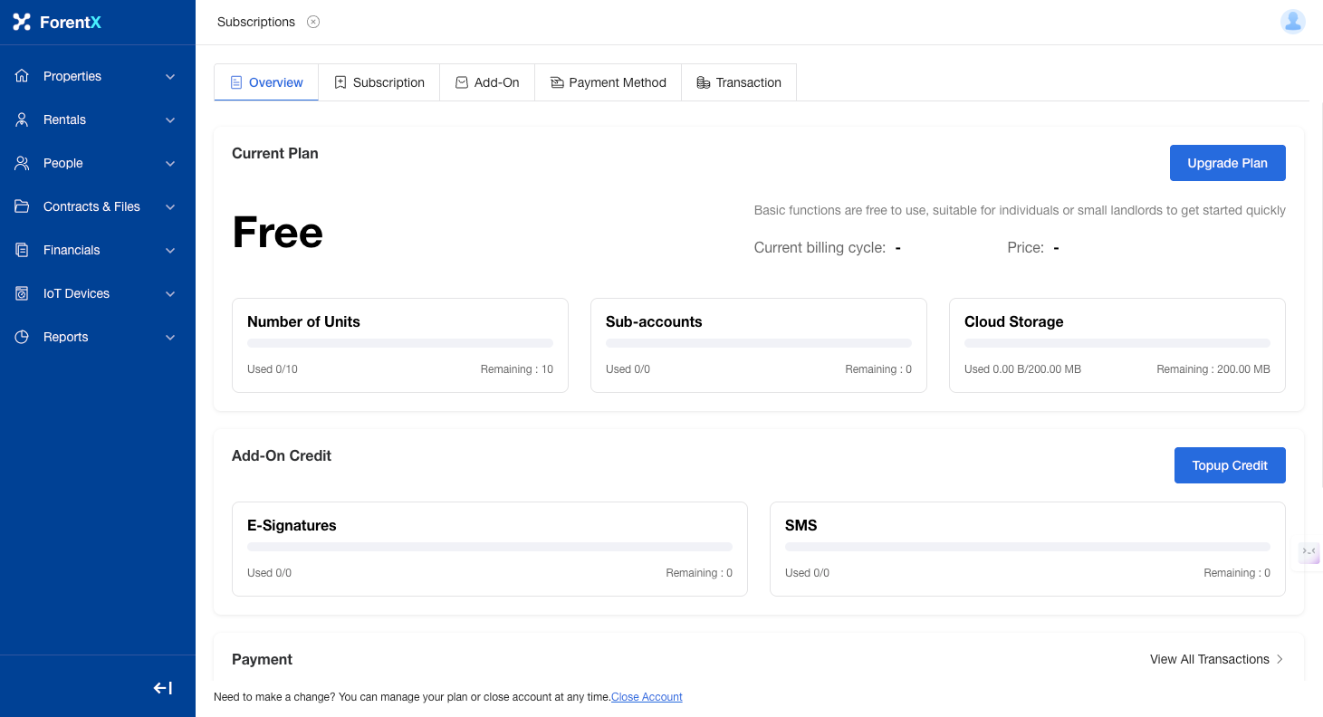 Entry: Select [Profile Icon] at the top of the page — [Subscription]. You can view your current plan, value-added services, usage, and payment information in the Homepage Overview.