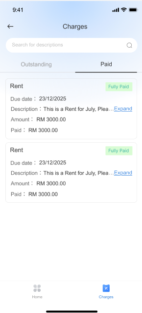 Entry: Select the [Charges] TAB, and view your paid bills in the [Paid] list. The Bill Status will be updated to "Paid."